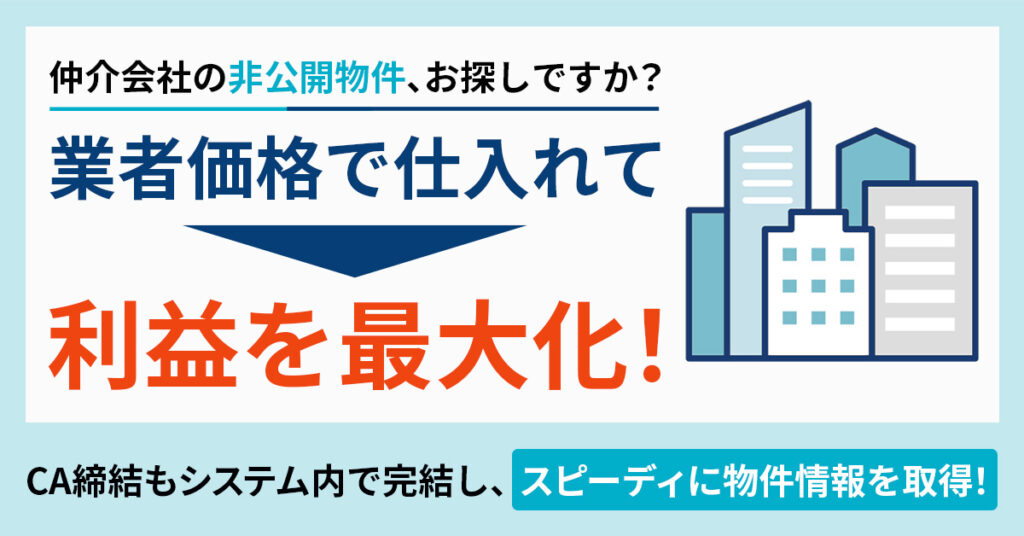 本記事では、検索キーワード“非公開物件 仕入れ”で上位表示を目指すための情報はもちろん、具体的な仕入れルートの開拓法や“業者価格”のメリット、また“CA締結”を活用した物件情報取得のポイントなどを整理していきます。