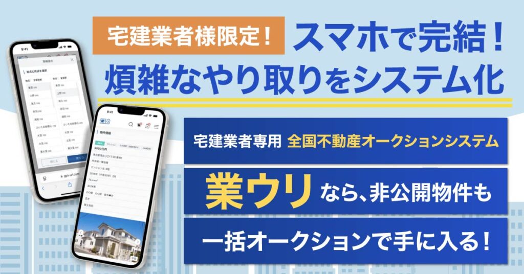 ここまで読んでいただいた方にはもうお分かりかと思いますが、“非公開物件 仕入れ”は“スピード”と“効率”が命です。“業ウリ”などの“宅建業者専用プラットフォーム”を活用すれば、“煩雑な書類のやり取り”や“面倒な手続き”を劇的に削減でき、なおかつ“高利回り・高需要の非公開物件を手に入れる”チャンスが大幅に増します。