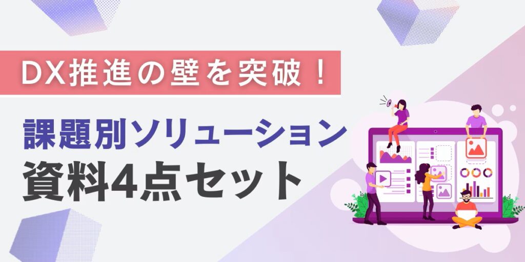 現場で役立つ具体的な打ち手を解説した4つの資料をまとめてダウンロードいただけます。「DXが進まない…」「ツール導入後の効果が実感できない…」といったお悩みをお持ちの方におすすめです。
