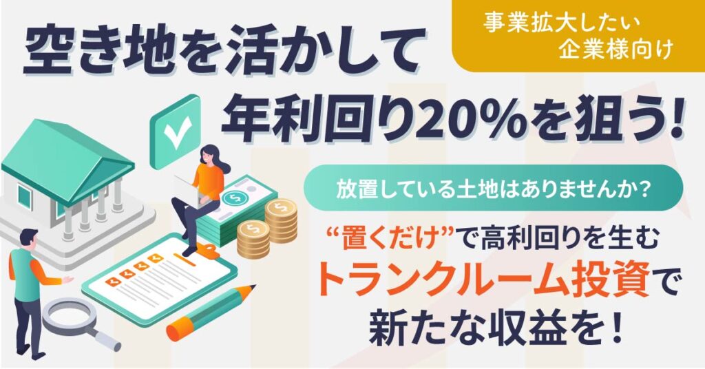 数百坪も必要ありません。わずかなスペースでもスタートできる“トランクルーム投資”なら、“土地を持つ経営者”や“地主”にとって、リスクを抑えながら高い利回りを狙える投資先としていま注目を集めています。実際、空き地に設置するコンテナを貸し出すだけで、毎月安定した賃料収入が得られるケースが少なくありません。