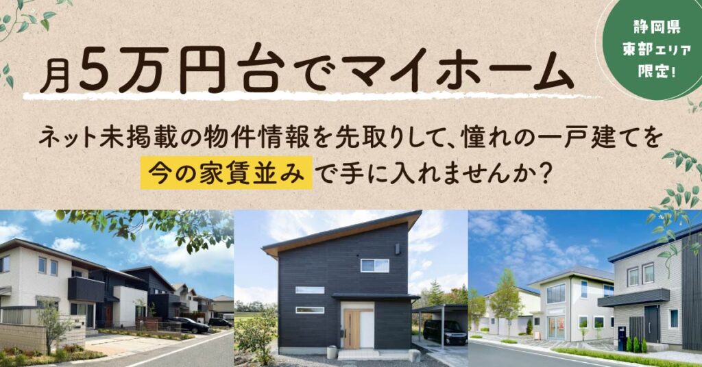 本記事では、“家賃並み”でマイホームを持つための具体的な方法やメリット、そして誰もが気になる「ネット未掲載物件」の情報収集術まで、詳しく解説していきます。実際に静岡県東部エリアでは、月5~6万円台でローンを組めるケースが多々あり、“賃貸と変わらない負担”で資産形成を進められる絶好の環境です。
