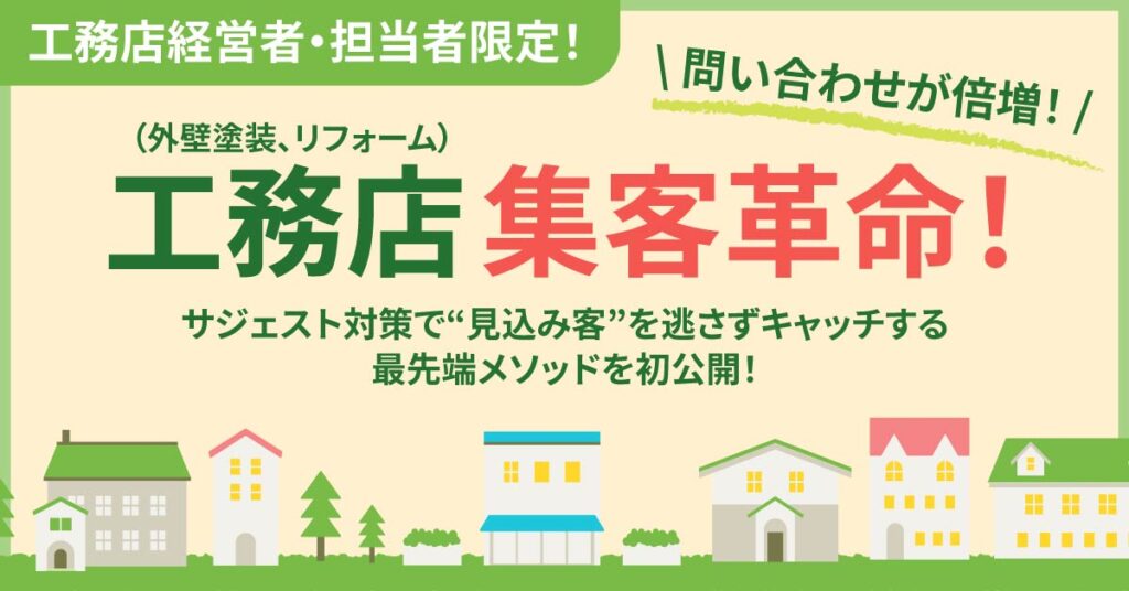 当社では、“工務店(外壁塗装・リフォーム)”に特化した“サジェスト対策”を中心に、“短期間”で“直接問い合わせ”を増やす最先端のメソッドを多数ご用意しています。