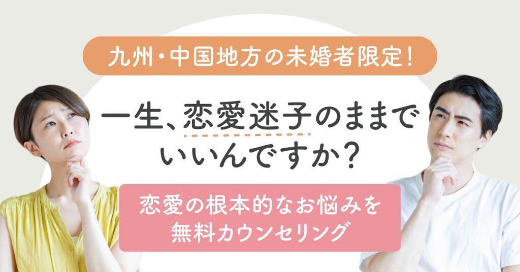 上記ページでは、九州・中国地方にお住まいの未婚の方を対象にした“恋愛・婚活の根本的なお悩み”を解決する無料カウンセリングの詳細をご覧いただけます。