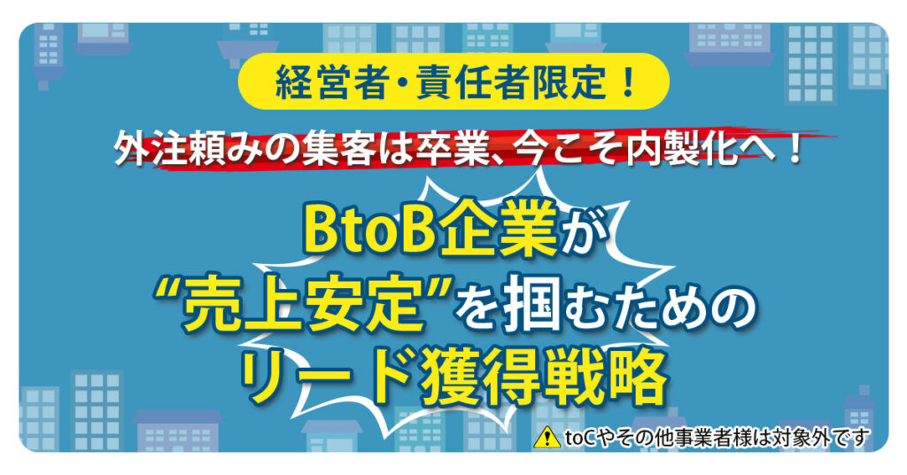 当社では、BtoB企業の経営者・マーケティング責任者・営業責任者の方を対象に、“Web広告運用”や“SEO”、“テレアポ”、“フォーム営業”、“展示会”など、様々なリード獲得手法を組み合わせた内製化支援を行っています。外注頼みを卒業し、“安定的な売上”を掴むための具体的なアプローチをカスタマイズしてご案内しています。