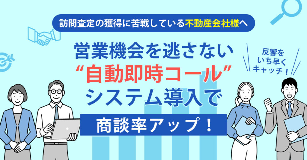 ここまで解説してきたように、不動産業界で“訪問査定”を逃さず獲得するためには、“不動産 反響 対応”のスピードアップが欠かせません。特に“自動即時コール”などのシステムを導入すれば、担当者の負担を最小化しながら商談率の向上が見込めます。