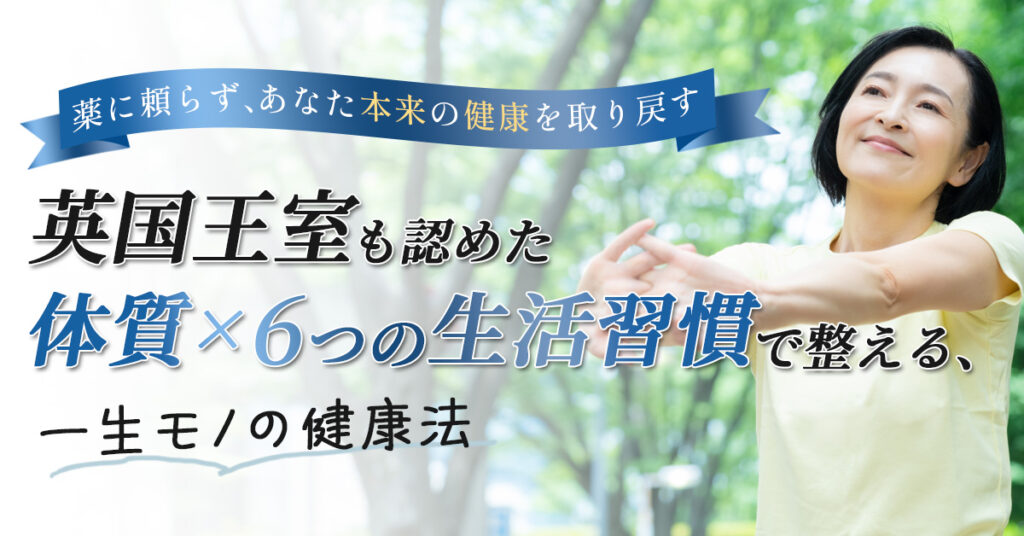 さて、もし“何をやっても結局うまくいかない”というジレンマを抱えている方は、以下の“六命健康法”という資料(というより担当者からのご案内)をご覧になってみてください。英国王室や世界の要人も実践しているとされる“2つの体質タイプ”と、それに合わせた“6つの生活習慣”で体を整えるというユニークな健康法です。