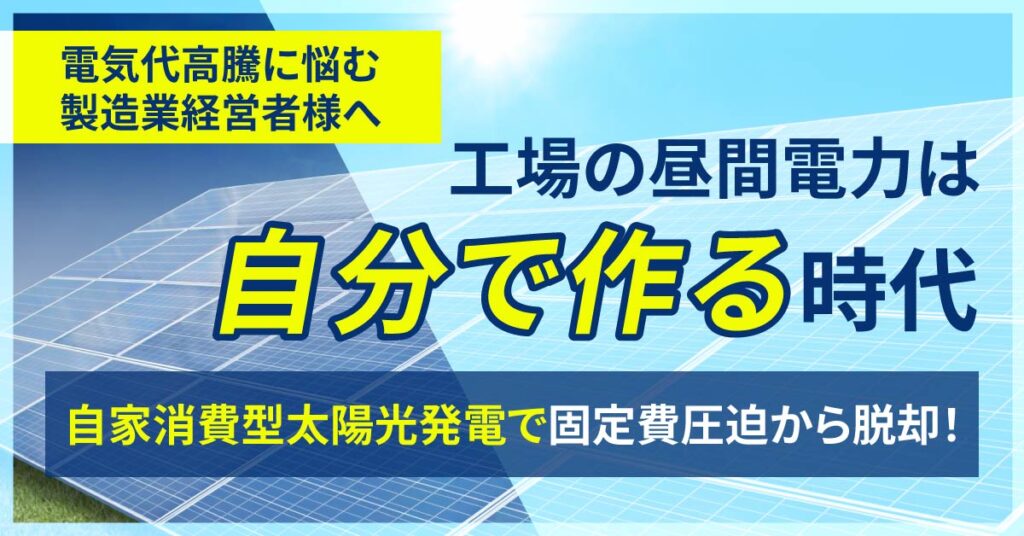 そんな中、製造業の経営者が目を向け始めたのが“自家消費型太陽光発電”という解決策。昼間の豊富な日射を活かし、外部からの電力購入を大幅にカットすることで、固定費を撃破する選択肢が現実味を帯びています。