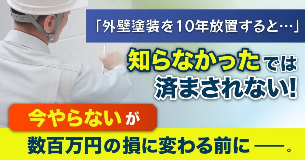 「外壁塗装なんてまだ大丈夫だろう」「10年過ぎたけれど、見た目がそこまで傷んでいないから平気」――もしそんな風に考えて“外壁塗装”を放置しているとしたら要注意です。実は、“知らないうちに数百万円の損失”へと直結しかねない重大なリスクが潜んでいます。
