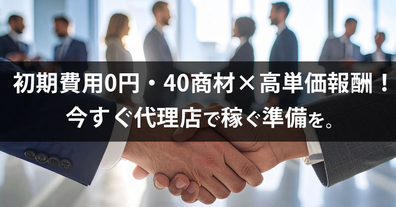 最もおすすめなのが、初期費用・ロイヤリティ・固定費すべて0円で始められる代理店ビジネスです。40以上の商材を扱えるため、紹介先のニーズに応じて最適な商品やサービスを提案できます。