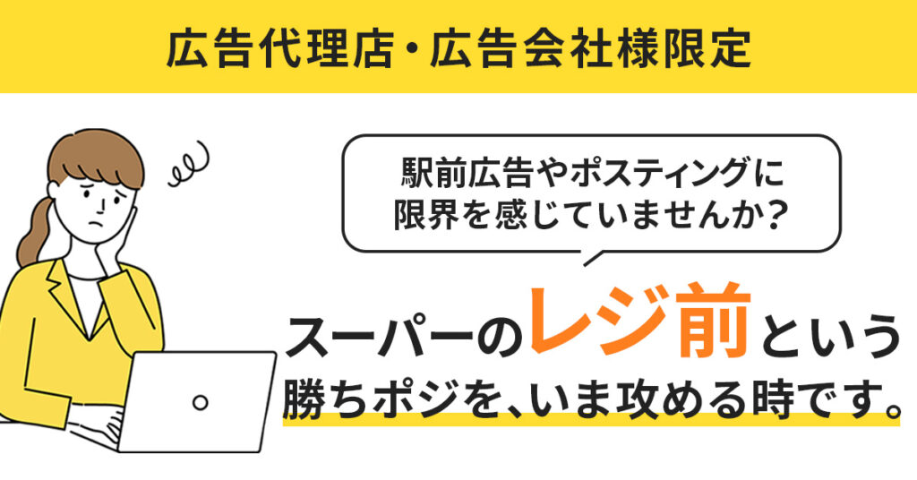 ポスティングや駅前広告に限界を感じている今こそ、新たな一歩を踏み出す時です。スーパーのレジ前という「勝ちポジション」を、今すぐ攻略しましょう。
