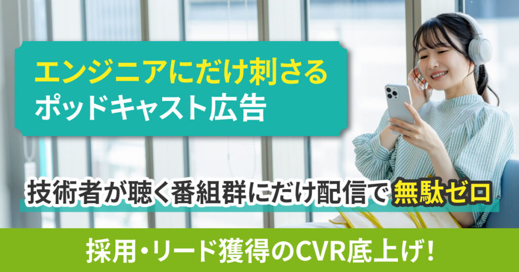 成功企業が採用している新手法の一つが、エンジニア向けポッドキャスト広告の活用です。この手法の最大の特徴は、技術者が聴く番組群にのみ配信する職種特化型広告 であることです。つまり、エンジニア以外の層への無駄な配信を完全に排除できるのです。