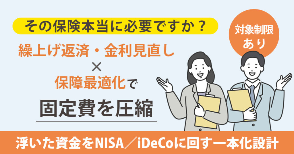 そこで本記事では、住宅ローンと保険を同時に見直すことで実現できる「一本化設計」について詳しく解説します。この方法を活用することで、固定費を最大40%削減し、削減した資金をNISAやiDeCoなどの資産形成に回すことが可能になります。