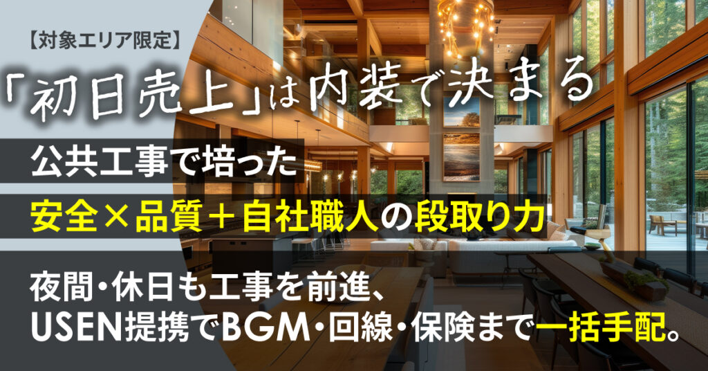 内装工事は、事業の成功を左右する重要な投資です。初期費用だけでなく、長期的な維持管理コストまで考慮に入れ、総合的な判断で業者を選ぶことが重要です。10年保証とかし保険という二重の安心を提供できる業者を選ぶことで、事業に専念できる環境を整えることができるでしょう。