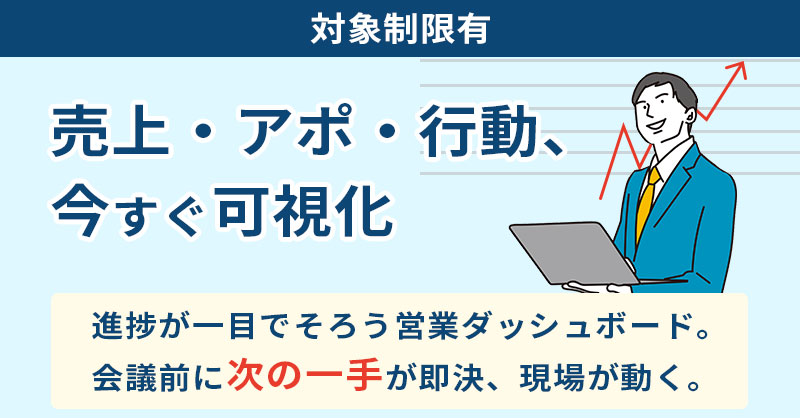 もし、現在の営業管理に課題を感じている、あるいは更なる生産性向上を目指しているのであれば、一画面での見える化という新しいアプローチを検討してみてはいかがでしょうか。