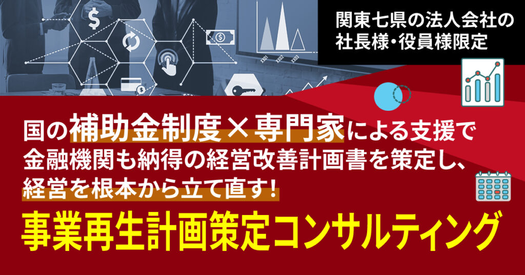 <関東七県の法人会社の社長様・役員様限定>国の補助金制度×専門家による支援で金融機関も納得の経営改善計画書を策定し、経営を根本から立て直す!事業再生計画策定コンサルティング