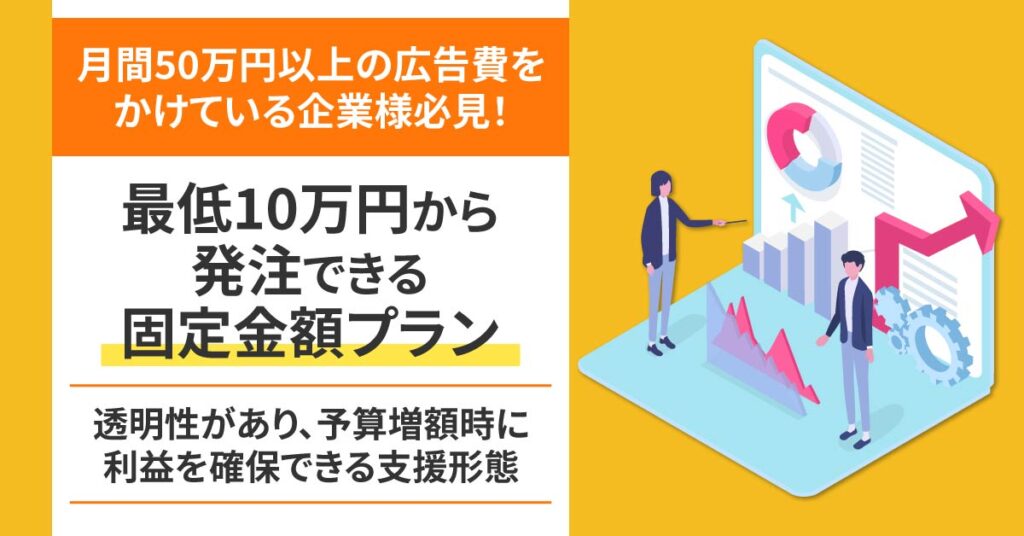 月間50万円以上の広告費をかけている企業様必見!最低10万円から発注できる固定金額プラン 透明性があり、予算増額時に利益を確保できる支援形態