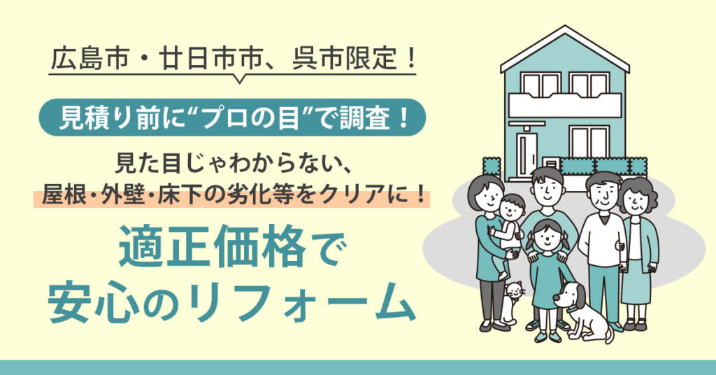 <広島市・廿日市市、呉市限定!>見積り前に“プロの目”で調査! 見た目じゃわからない、屋根・外壁 床下の劣化等をクリアに!適正価格で安心のリフォーム