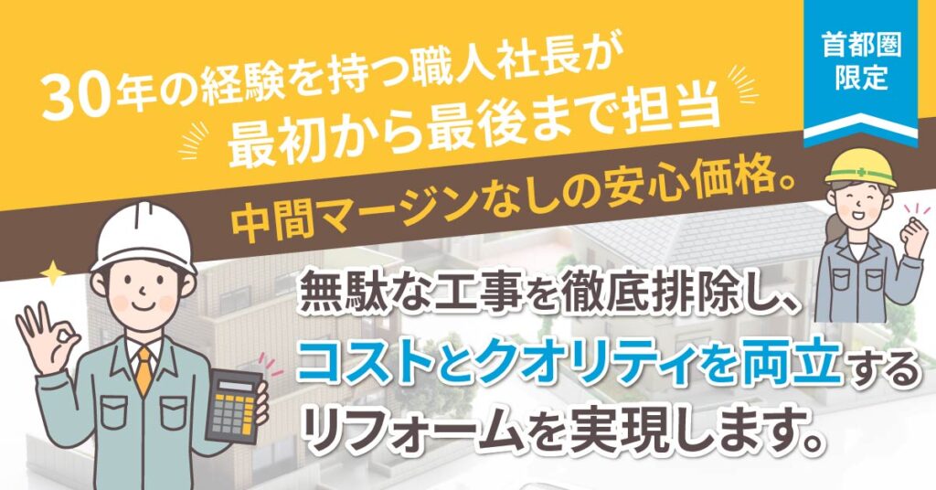 <首都圏限定>30年の経験を持つ職人社長が最初から最後まで担当 中間マージンなしの安心価格。無駄な工事を徹底排除し、コストとクオリティを両立するリフォームを実現します。