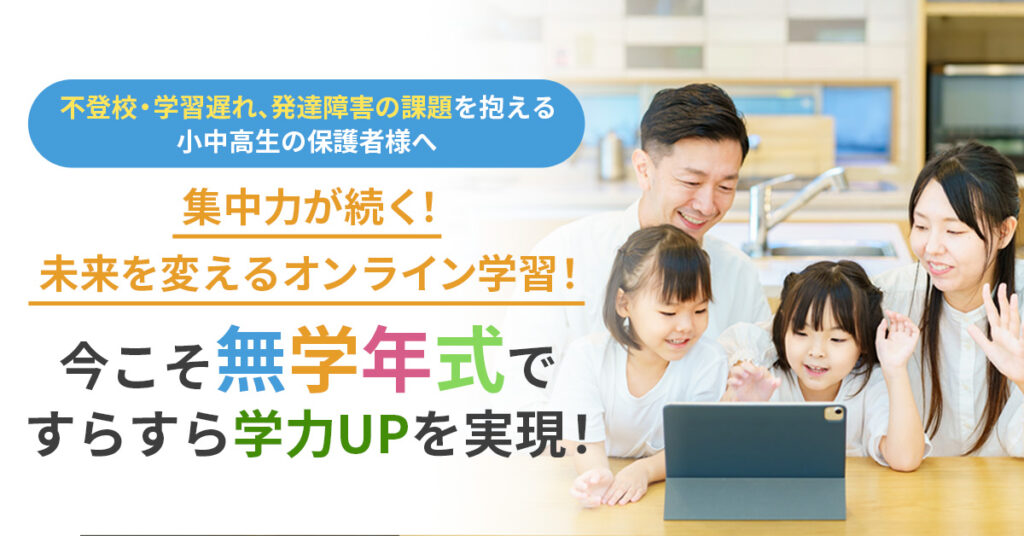 集中力が続く!未来を変えるオンライン学習!不登校や学習遅れ、発達障害のお子さまも安心。今こそ“無学年式”ですらすら学力UPを実現!