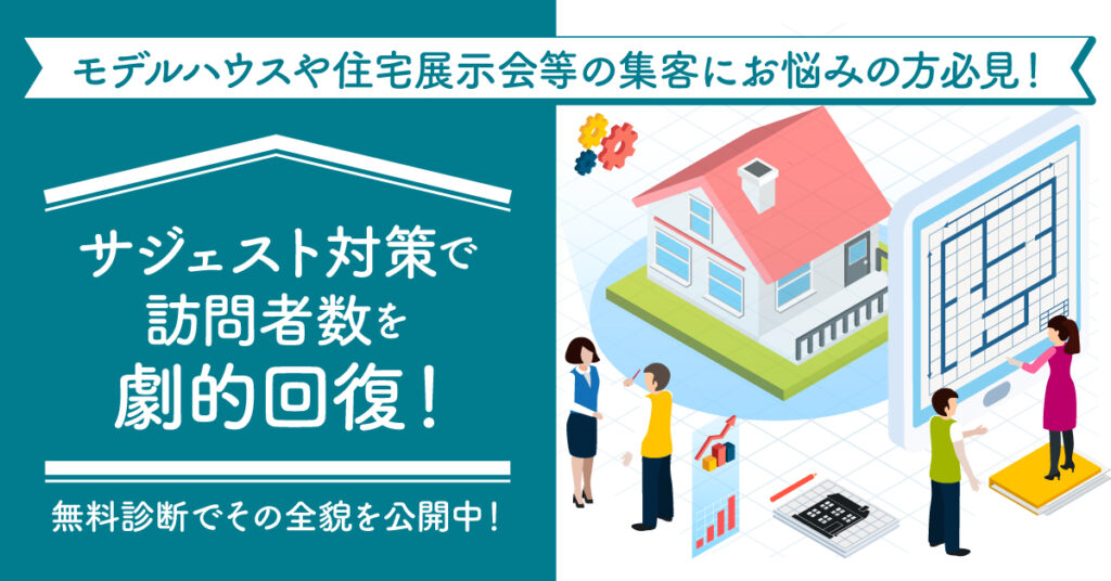 モデルハウスや住宅展示会等の集客にお悩みの方必見!サジェスト対策で訪問者数を劇的回復!無料診断でその全貌を公開中!