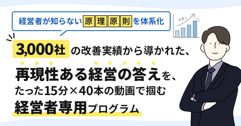 経営者が知らない“原理原則”を体系化 3,000社の改善実績から導かれた、“再現性ある経営の答え”を たった15分×40本の動画で掴む経営者専用プログラム