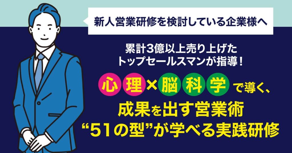 <新人営業研修を検討している企業様へ>累計3億以上売り上げたトップセールスマンが指導!心理×脳科学で導く、成果を出す営業術“51の型”が学べる実践研修