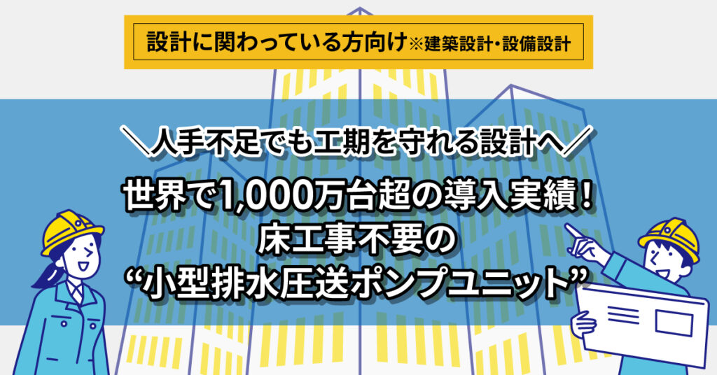 <設計に関わっている方向け※建築設計・設備設計>人手不足でも工期を守れる設計へ 世界で1,000万台超の導入実績!床工事不要の”小型排水圧送ポンプユニット”