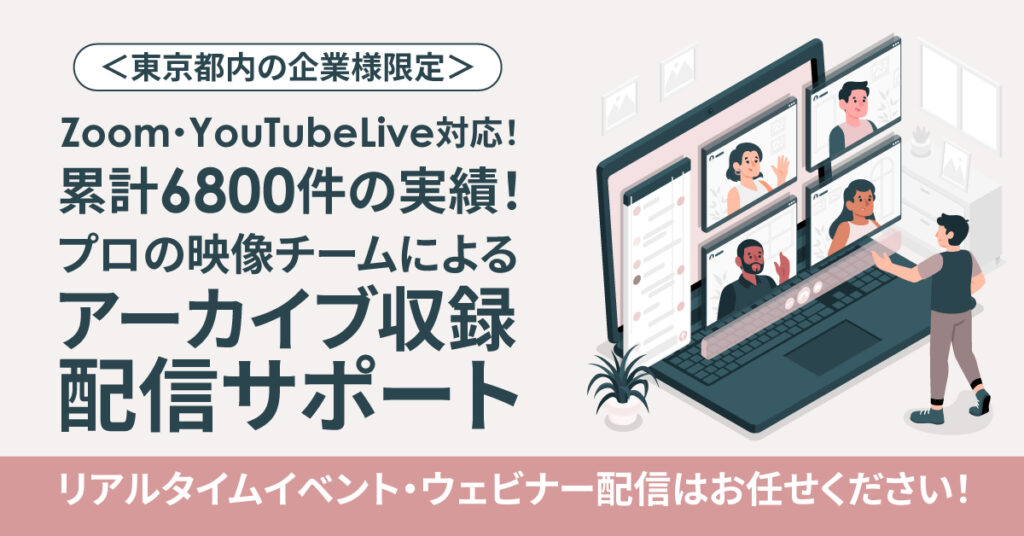 <東京都内の企業様限定>リアルタイムイベント・ウェビナー配信はお任せください!Zoom・YouTubeLive対応!累計6800件の実績!プロの映像チームによるアーカイブ収録・配信サポート
