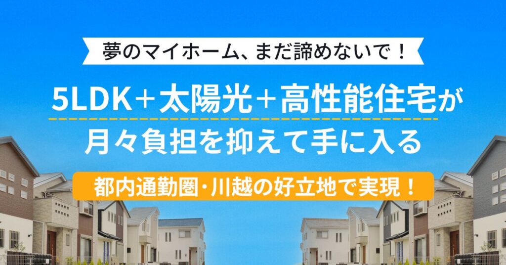 夢のマイホーム、まだ諦めないで!5LDK+太陽光+高性能住宅が月々負担を抑えて手に入る。都内通勤圏・川越の好立地で実現!