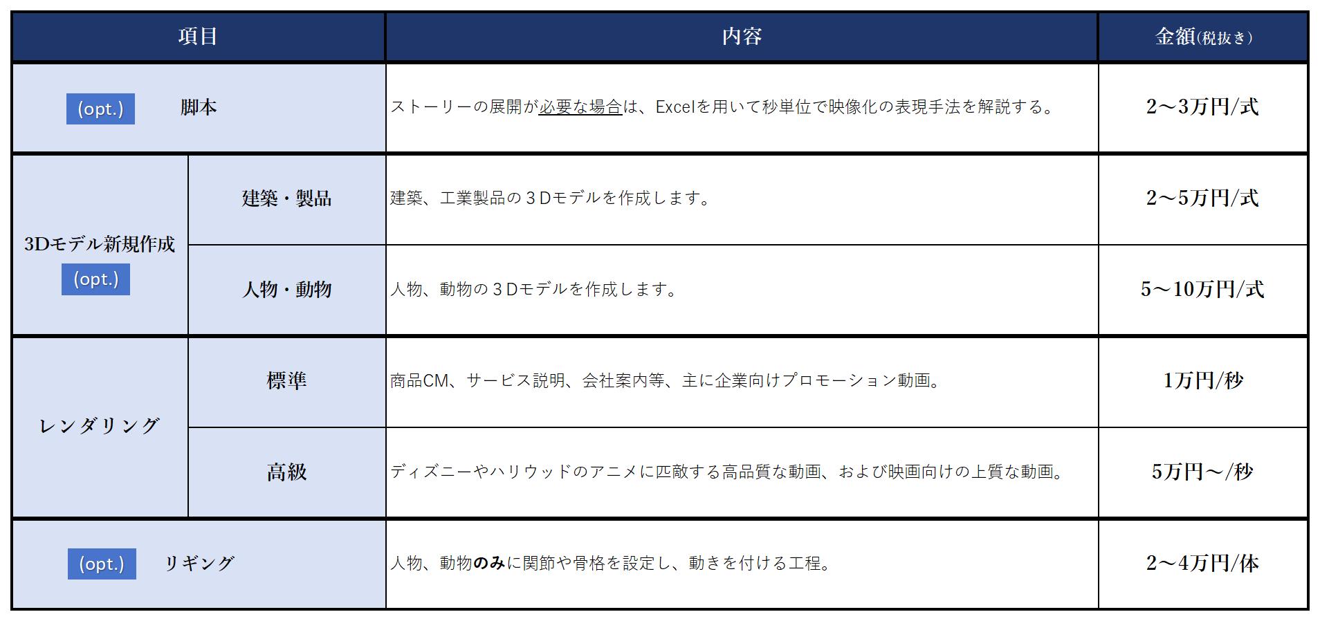 合計費用=「脚本」+「3Dモデル作成」+「リギング」+「レンダリング」