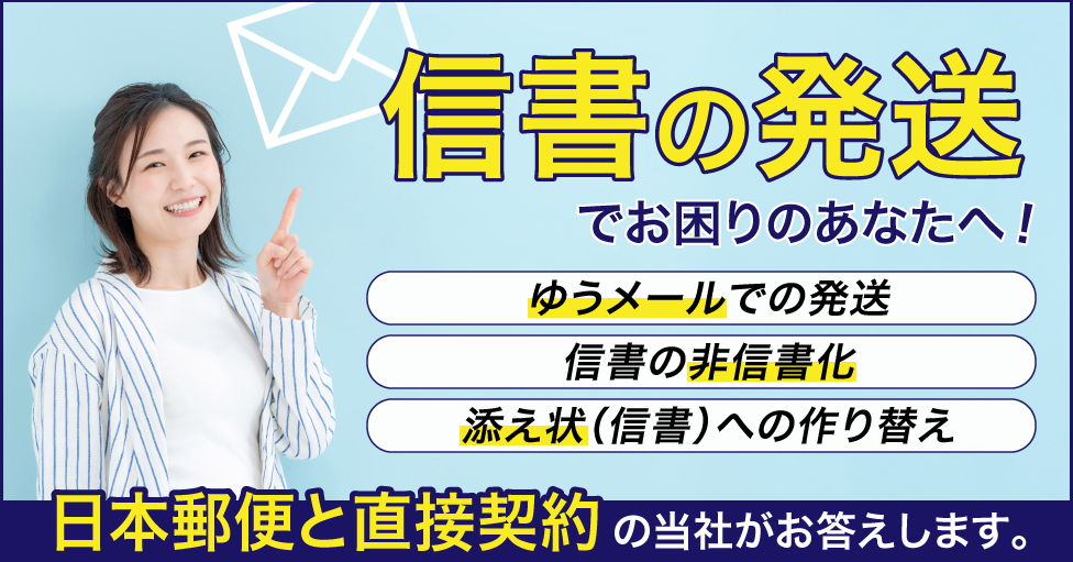 信書の発送でお困りのあなたへ! 『ゆうメールでの発送』、『信書の非信書化』、 『添え状(信書)への作り替え』 — 日本郵便と直接契約の当社がお答えします。