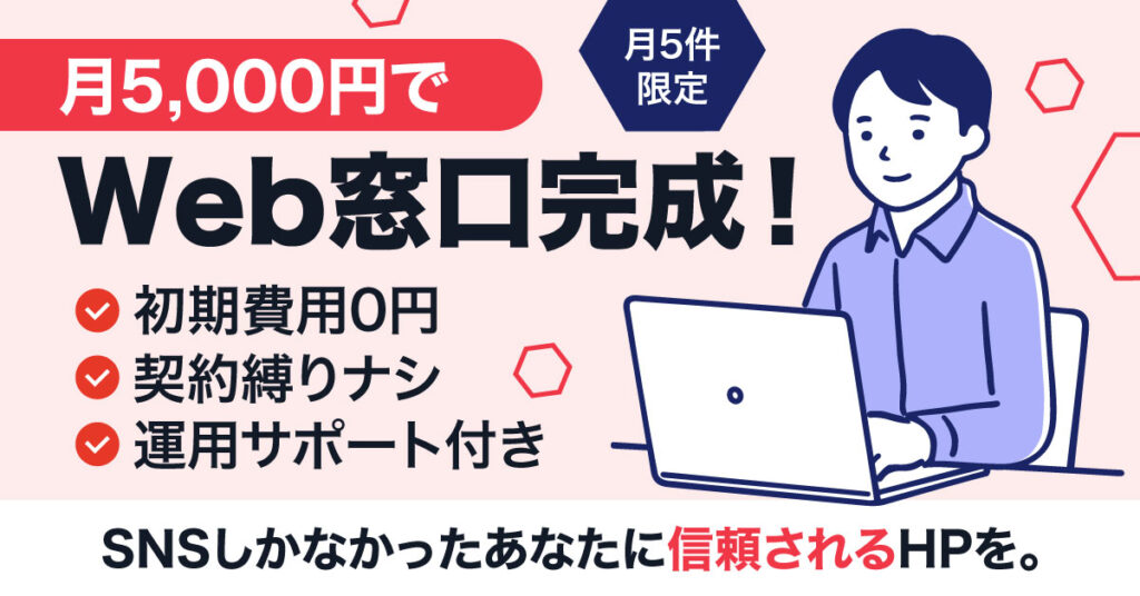 月5,000円でWeb窓口完成!月5件限定。初期費用0円/契約縛りナシ/運用サポート付き。SNSしかなかったあなたに“信頼される”HPを。