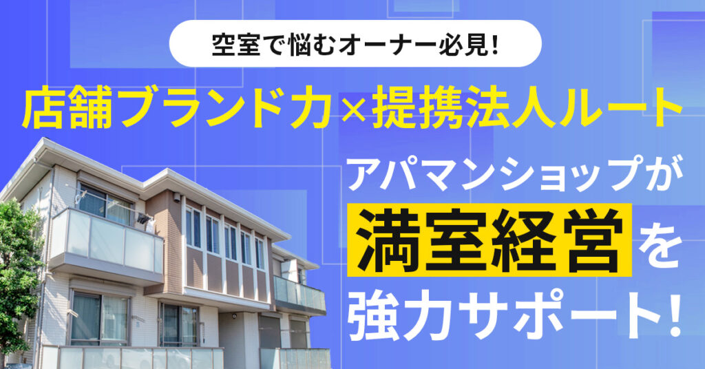 《対応可能物件エリア:東京都・神奈川県・千葉県・埼玉県(神奈川県・千葉県・埼玉県はエリア要相談)》空室で悩むオーナー必見!店舗ブランド力×提携法人ルート アパマンショップが「満室経営」を強力サポート!