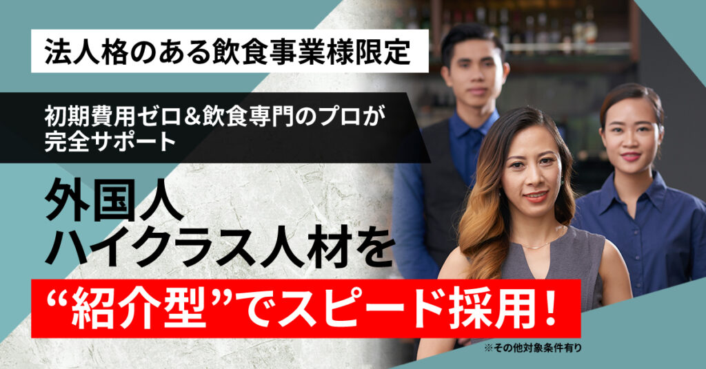本サービスは、飲食業界に特化した完全成功報酬型の人材紹介サービス。国内外の即戦力人材を、初期費用ゼロ・採用時のみ料金発生の低リスクでご紹介。